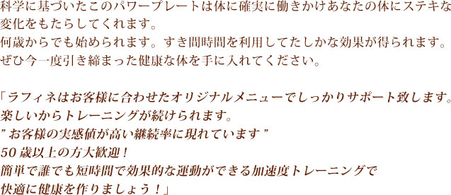 さらに下肢の筋肉が丈夫になると、筋肉のポンプ作用が強化されて血液循環が良くなります。短時間で効率よく、年齢、ライフスタイル、身体能力を問わず、その人ごとの体調に合わせ、無理なく安全にトレーニング効果をあげられることが最大の特徴です。